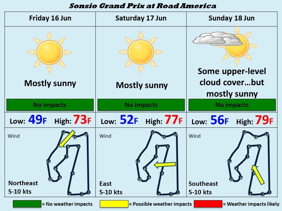 Weather will be a non-issue this weekend, unless you’re wanting to talk about how nice it is. Our friend, IndyCar Weatherman over on Twitter (@Indycar_Wxman) posted this recently. Follow him if you don’t. He’s the best for up to date weather for every race weekend. Paul Dalbey and I met him at Pocono one year – great guy, and very qualified. Trust me!