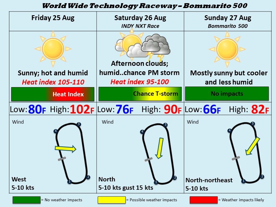 Fortunately, there will be no track activity today. That starts tomorrow morning, when the forecast is much more favorable. Saturday’s high is only 90°. That’s not exactly pleasant, but is more in-line with what you would expect in St. Louis in late August. A cold-front passes through, bringing a chance for storms on Saturday afternoon. What it also brings is a near-perfect day on Sunday for the race. Low-humidity and clear skies are being called for, for Sunday. The low will be 66° and the high will be 82°. You could not ask for better conditions for a day race in August. These conditions were brought to you by IndyCar Weatherman, the best in the business. You can follow him on Twitter at @IndyCar_Wxman.