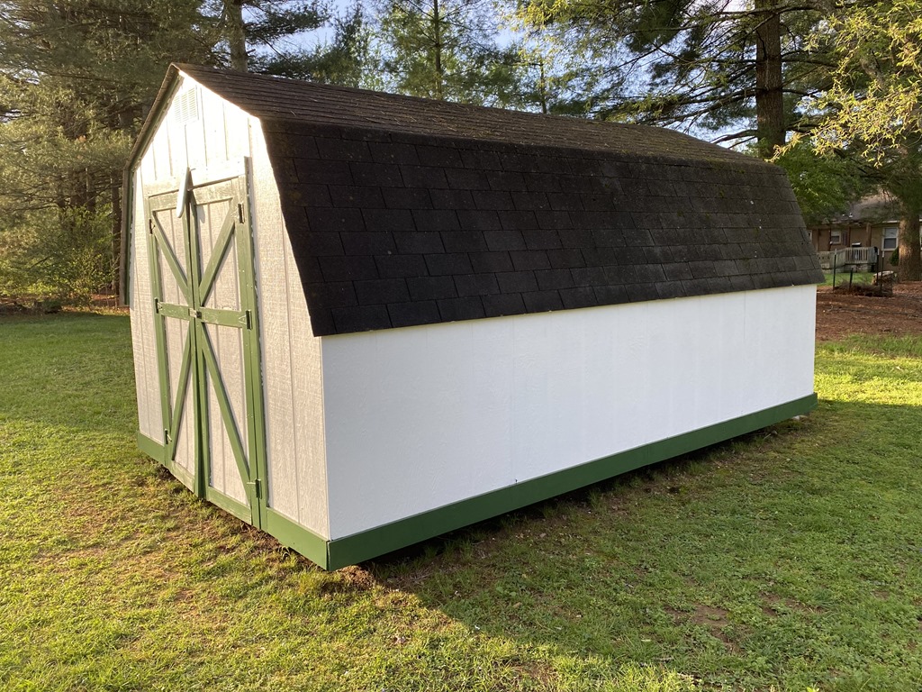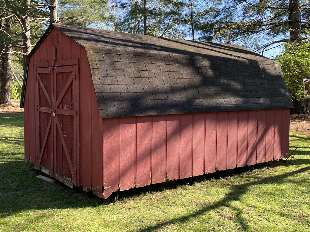 We have an old storage barn in our backyard. I have no idea how old it is, but I’m guessing it’s from the 80s or early 90s. I can tell it has been re-painted at least once over the years. It is very sturdy and dry on the inside, but the exterior is in bad shape some of the cross-timbers on the front have rotted and fallen off, and critters have made several meals out of the bottom edges of the structure. It may have been sound on the inside, but it had become an eyesore on the outside.