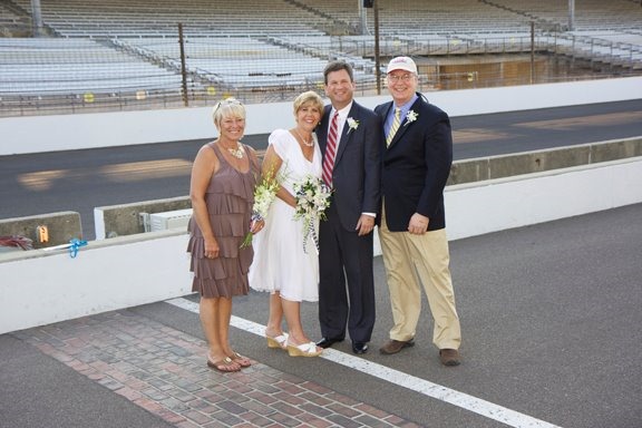But the biggest perk they provided us – the chance to get married at IMS in their suite on May 18, 2012. They even provided the catering and the champagne. It was a small affair that took place after the track had closed for Fast Friday, with very few invited guests. Susan’s lifelong friend, Peggy Jennings served as her Matron of Honor, while my One Take Only cohort, John McLallen was my Best Man. Paul Dalbey was our photographer. As Susan and I were exchanging our vows, I was distracted by the site of Calhoun, the 1963 winner, being towed out in the pits. Parnelli Jones was scheduled to drive it the next day. Where did we take everyone for dinner that night? Dawson’s on Main, of course.