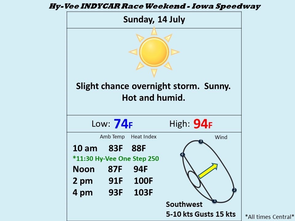 Good morning from an already balmy Iowa Speedway. The weather forecasts have been spot-on all weekend, so if the accuracy of the weather people continues – that means today will be the hottest day since we got here on Thursday. The high temperature for today is projected to be 94°. Fortunately, the green flag flies at 11:30 am CDT, meaning it will only be around 87° at that time.