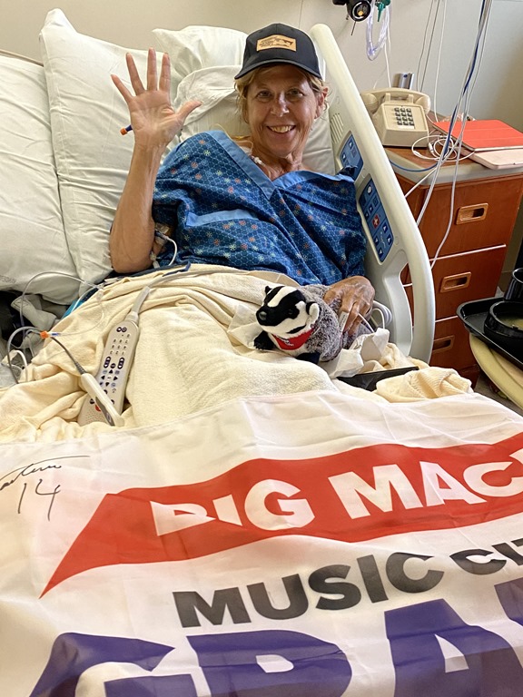 When I arrived here yesterday morning, I told her that we had just learned she was totally ruled out for the weekend – so release her seat if she needs to. She was very concerned about Susan, and said ‘Let me give you something to take back to her”. She reached under her desk and pulled out a large Music City Grand Prix flag that had been signed by Santino Ferrucci – her favorite driver (even though we are not supposed to have favorites). I took the flag to her this morning. She asked that the flag be spread out at the foot of her hospital bed, for when she watches the race later today. By the way, she is still doing great, and they will most likely release her on Monday.