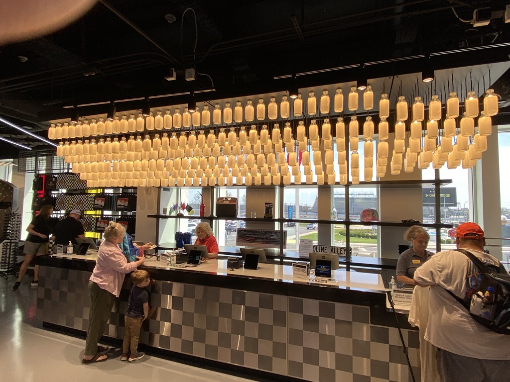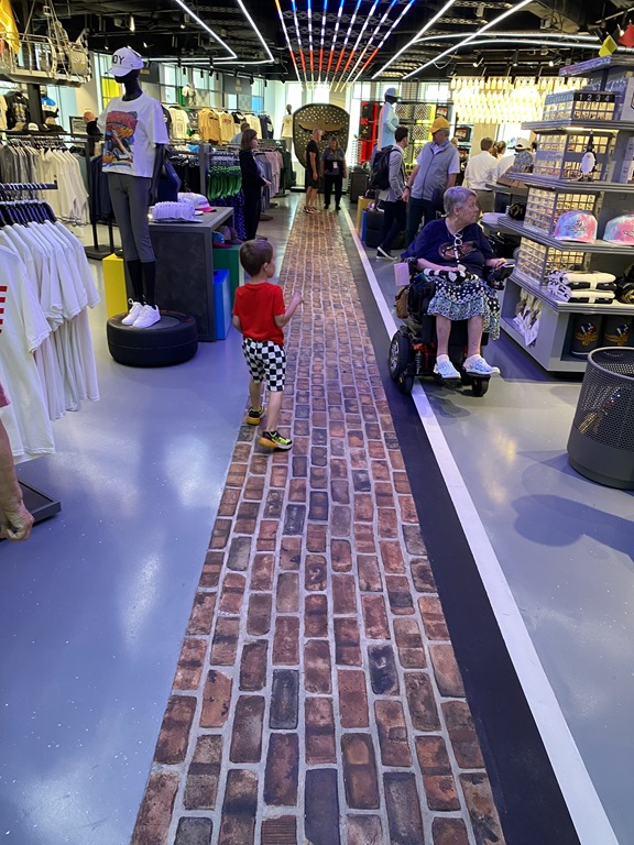 As we entered, we went to the right to go into the gift shop. It resembles nothing that we saw two years ago. Here are a few pics. Notice the milk-bottle lights over the cashier area. Also notice the Yard of Bricks that runs through the shop.